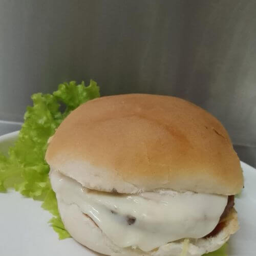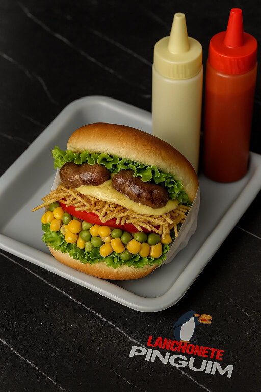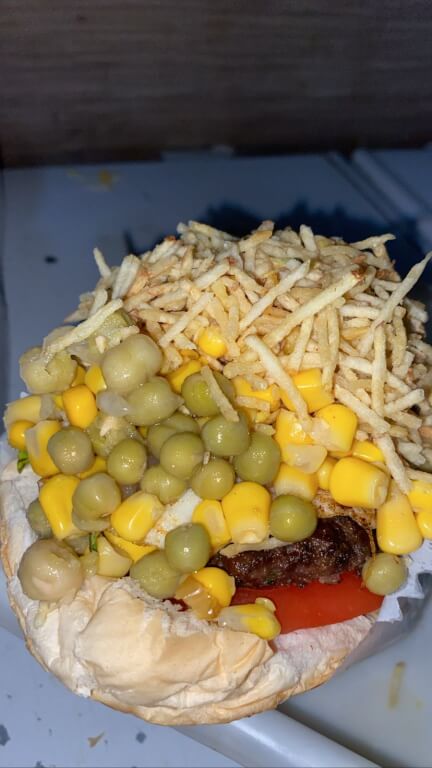 PAO, HAMBURGUER, QUEIJO, PRESUNTO, BACON, ALFACE, ERVILHA, MILHO, TOMATE E PALHA.
