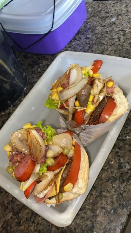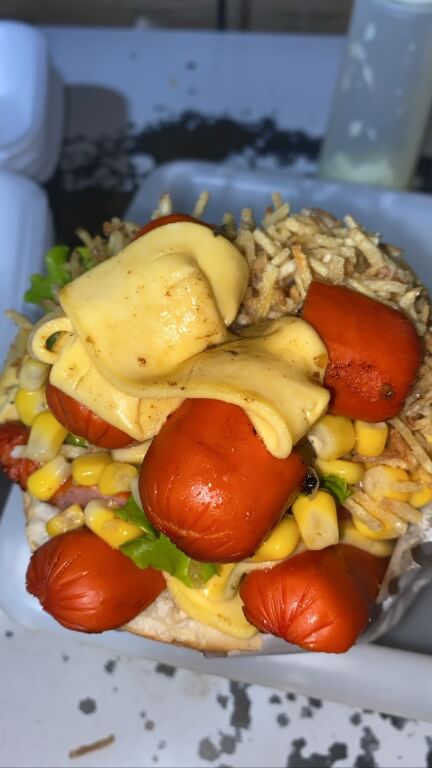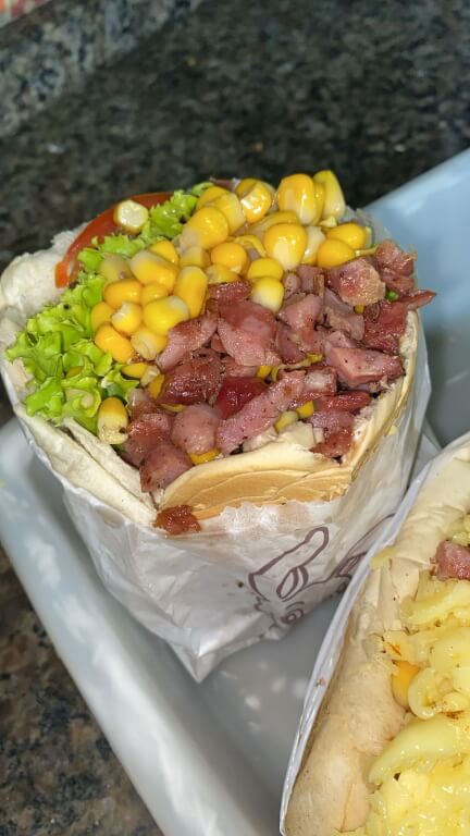 PAO, HAMBURGUER, BACON, SALSHICHA, CALABREZA, FRANGO, OVO, QUEIJO, PRESUNTO, PALHA, MILHO, ERVILHA, ALFACE E TOMATE.