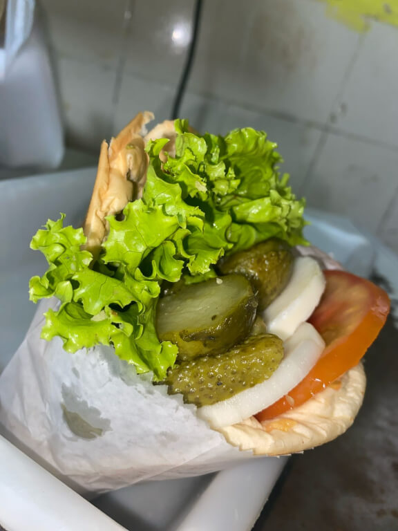 PAO, QUEIJO, PRESUNTO, CALABRESA, ALFACE, ERVILHA, MILHO, TOMATE E PALHA.